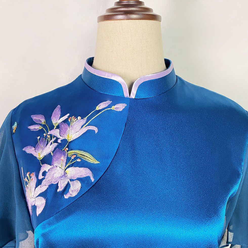 Black Silk Qipao with Lace Detail on Dark Turquoise Silk